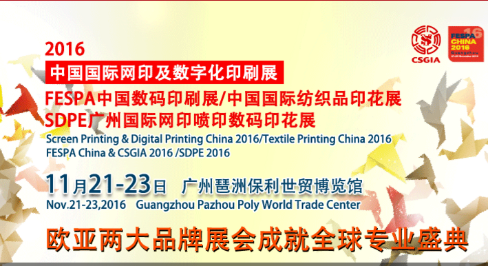 邁入第三十個年頭的“2016中國國際網印及數字化印刷展/FESPA中國數碼印刷展/中國國際紡織品印花展/SDPE廣州國際網印噴印數碼印花展”將于11月21—23日在廣州琶洲保利世貿博覽館隆重上演。作為亞洲地區最具影響力的行業大展,歷經過去三十年的成長,展會已成為中國目前規模最大、參與人數最多、影響力最廣、國際化程度最高的博覽會,已連續多年吸引大量海外展商。展會由中國網印及制像協會、廣州粵展展覽有限公司主承辦。目前已有600多家國內外優秀企業參加本次展會。